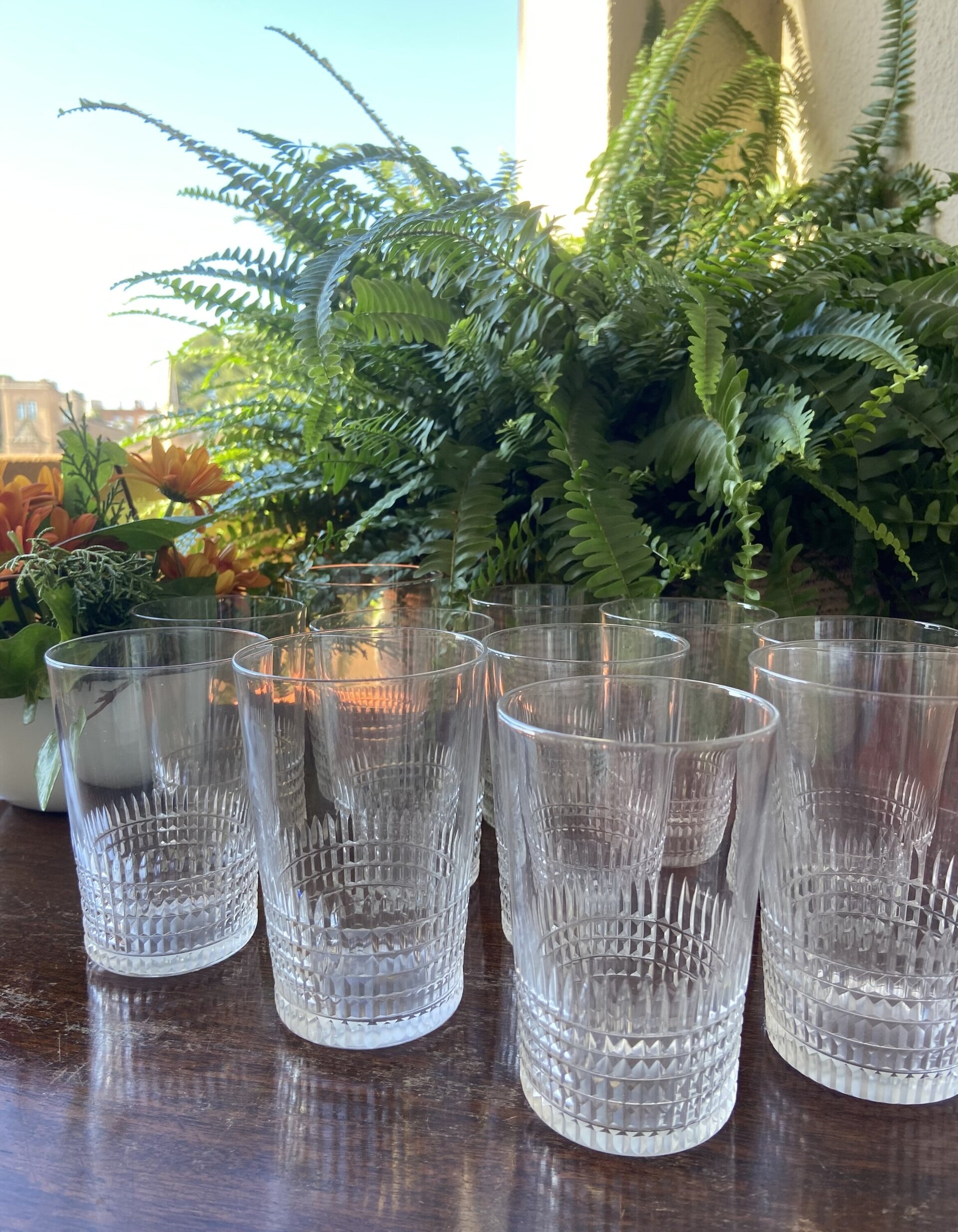 11 vasos de cristal con talla geométrica en la base.